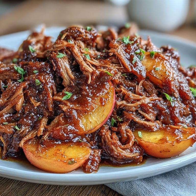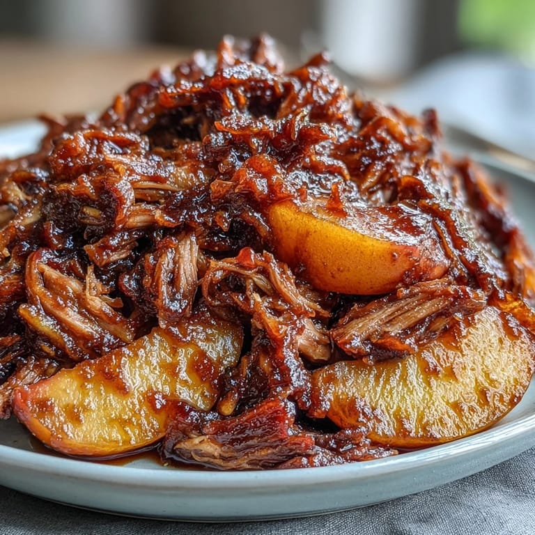 Save The aroma of sun-ripened peaches wafted through my kitchen the first time I made this pulled pork, blending with the smoky undertone of paprika as the slow cooker worked its magic. Outside, summer cicadas hummed and I remember pausing mid-prep to glance at a crumpled recipe note stuck to my fridge—something about honey and barbecue, scrawled after tasting a friend's backyard creation. My hands were sticky from peeling peaches, and as I mixed the sauce, I realized this recipe wasn’t just about flavor, it was about summer ease. By dinner, the meat was so tender I nearly laughed at how little effort went into such a big result. Every time I make this, the kitchen fills with sweet and tangy anticipation and a sense of relaxed celebration.
